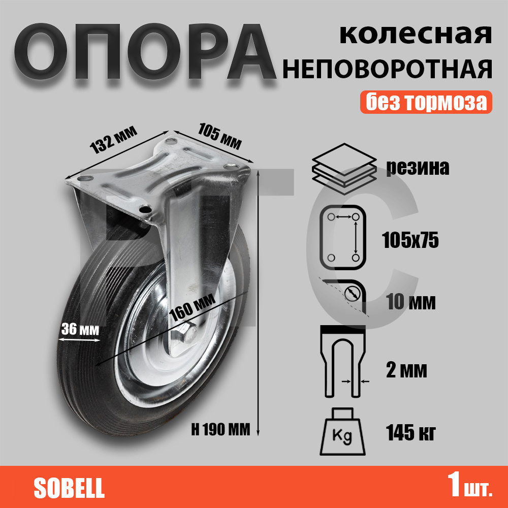 Размер Диаметр колеса 160мм, Ширина колеса 36мм, Общая высота 190мм, Габариты верхней плиты 132х105мм, Расстояние между отверстиями 105х75мм, Грузоподъемность 145кг Артикул Аналогов 37160, FC, 63 Вес, кг 1.475 -