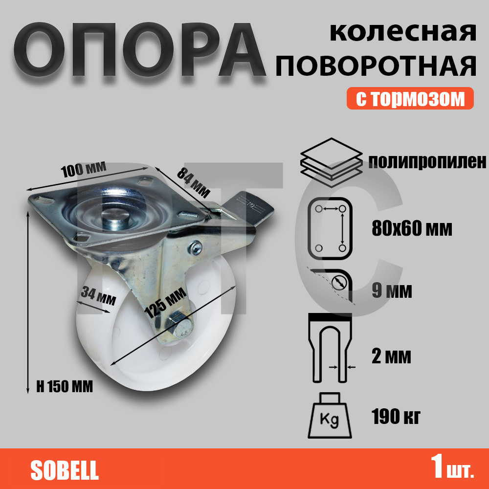 Размер Диаметр колеса 125мм, Ширина колеса 34мм, Общая высота 150мм, Габариты верхней плиты 100х84мм, Расстояние между отверстиями 80х60мм, Грузоподъемность 190кг Артикул Аналогов 452125, SRCnb, 55 Вес, кг 1.01 -