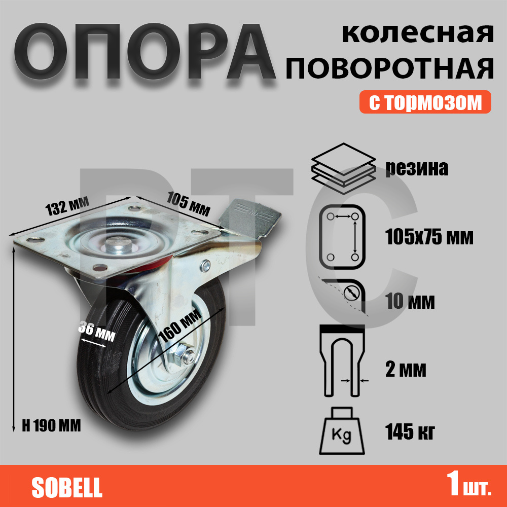 Опора колесная поворотная Ф160хS36 132×105хH190(105×75) 145кг с тормозом