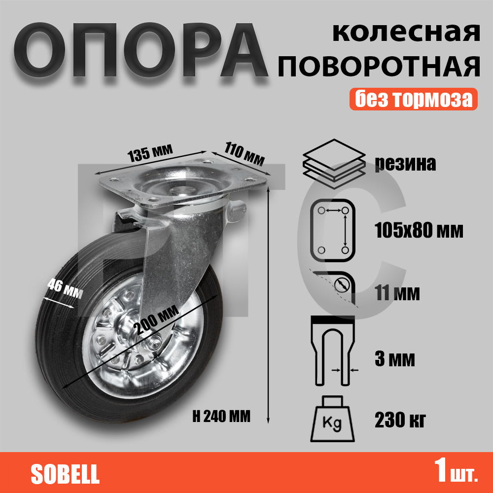 Опора колесная поворотная Ф200хS46 135x110хH240(105x80) 230кг