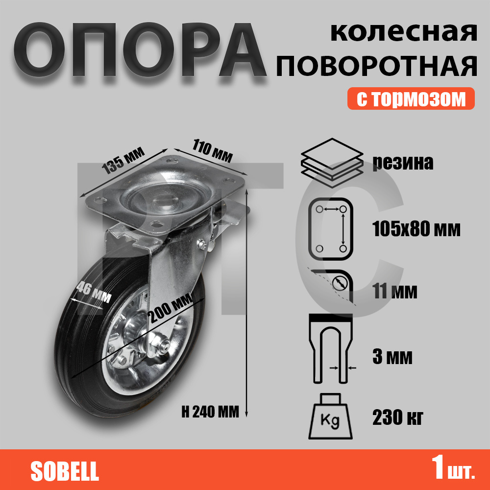 Опора колесная поворотная Ф200хS46 135x110хH240(105x80) 230кг с тормозом