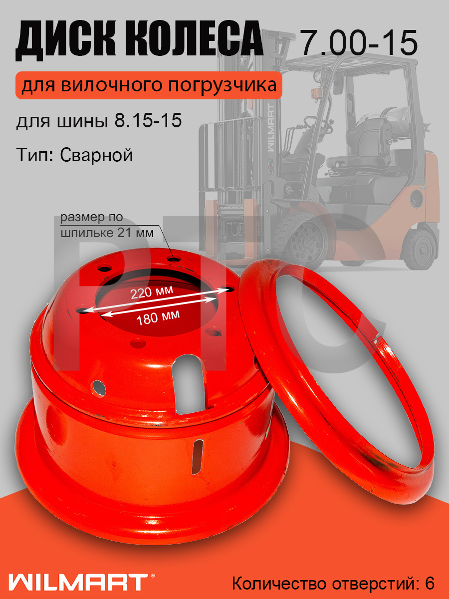 Бренды HANGCHA Марка спецтехники HANGCHA Размер 7.00-15, 6x220/ф180, отверстия d21 мм, вылет внешний 290 мм, общая высота всборе 290 мм, общий диаметр 457 мм. Применение Внешний Грузоподъемность 30-35 Вес, кг 28.5 -
